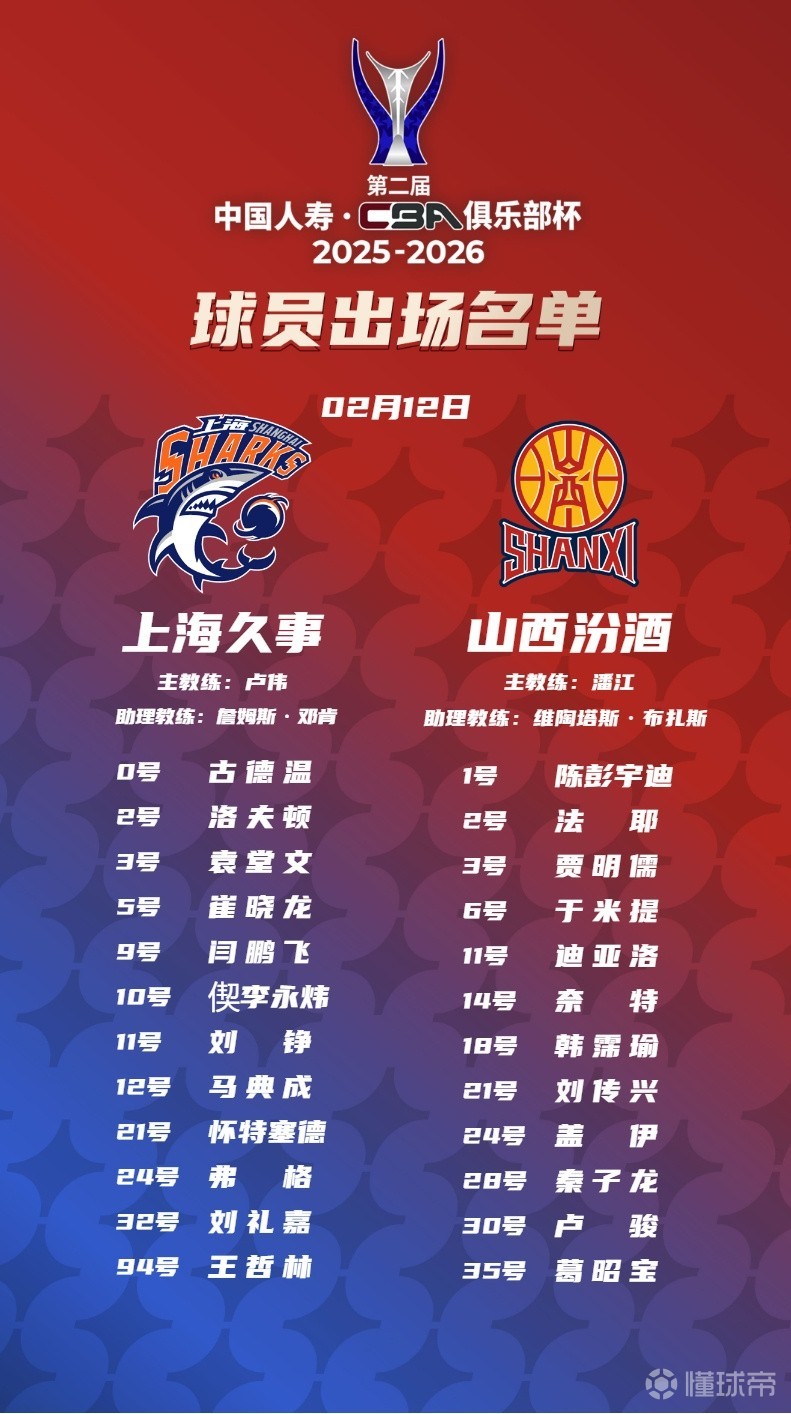 2月12日19:30,第二届CBA俱乐部杯决赛将在内蒙古呼和浩特打响,卫冕冠军上海久事对阵首次闯进全国大赛决赛的山西汾酒,以下是双方出场大名单。