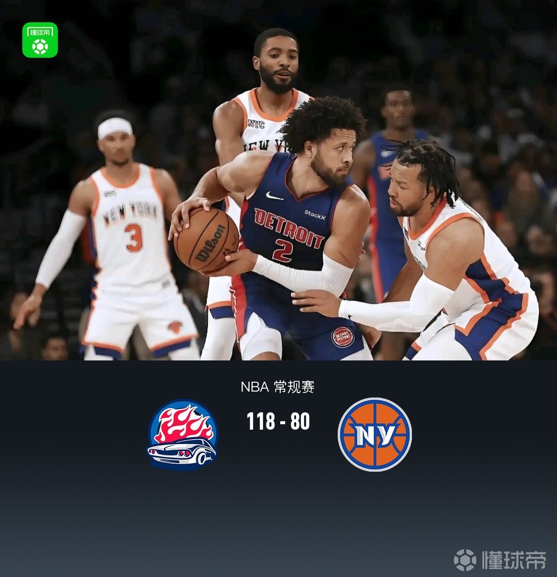 第四节,双方继续维持30分上下分差,随后双方早早换下主力进入练兵时间,活塞继续保持优势将分差拉大,最大领先43分,全场结束,活塞118-80尼克斯。