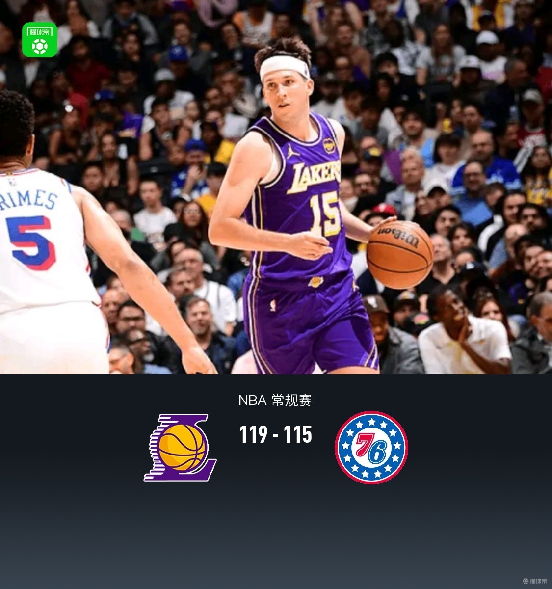 第四节,开节湖人里夫斯连投带罚连得8分直接反超6分,随后双方持续进攻不中,76人马克西造杀伤罚球止血,湖人延续势头节中斯马特、里夫斯一波三分雨直接领先13分,紧跟詹姆斯连续反击拉大至16分,随后76人轰出一波10-0追至6分重新拉回悬念,湖人詹姆斯、里夫斯得分稳住局面,而来到最后1分钟,76人埃奇库姆抢断三分命中,紧跟马克西冲框追至2分,比赛还剩27秒,最后阶段76人防守出现问题,湖人八村垒空篮打进,随着马克西三分不中,最终湖人119-115战胜76人。