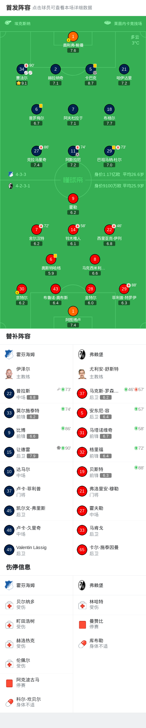 霍芬海姆vs弗赖堡:克拉马里奇、卡巴克首发,金特尔、霍勒出战