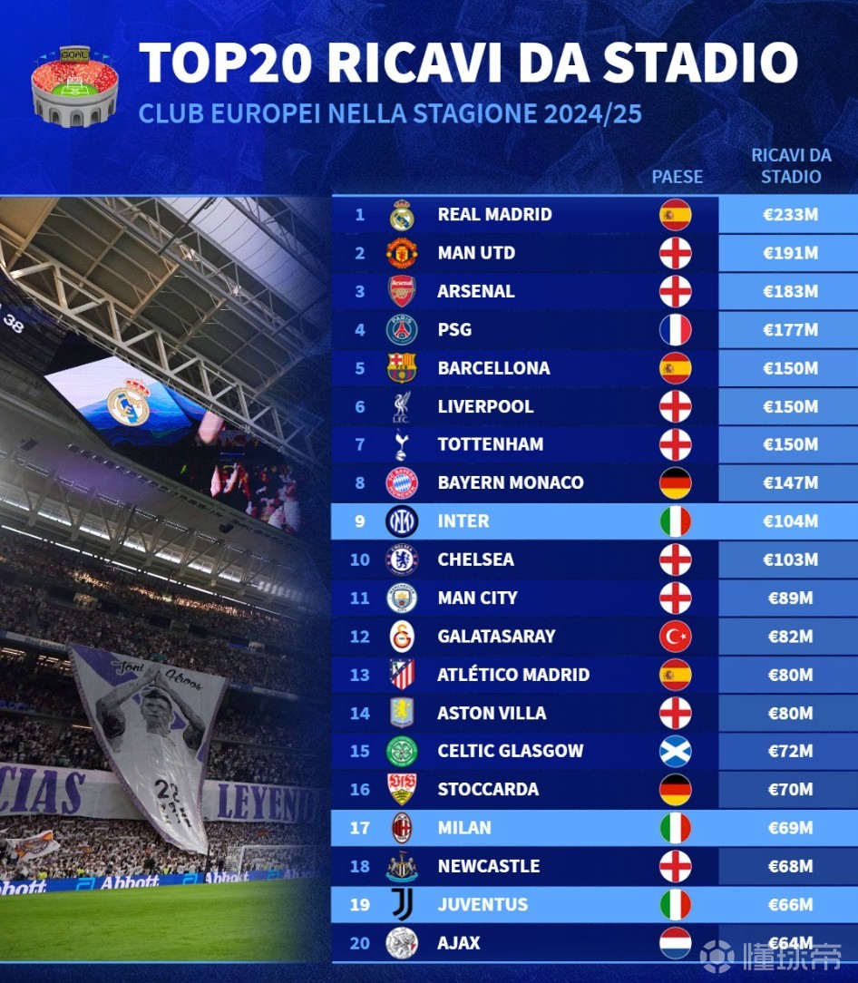 上赛季欧洲俱乐部门票收入:皇马2.33亿第1 曼联枪手二三位